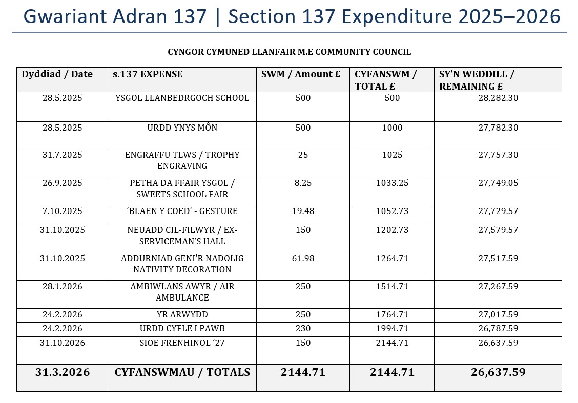 | Gwariant Adran 137 | Section 137 Expenditure 2025–2026 |